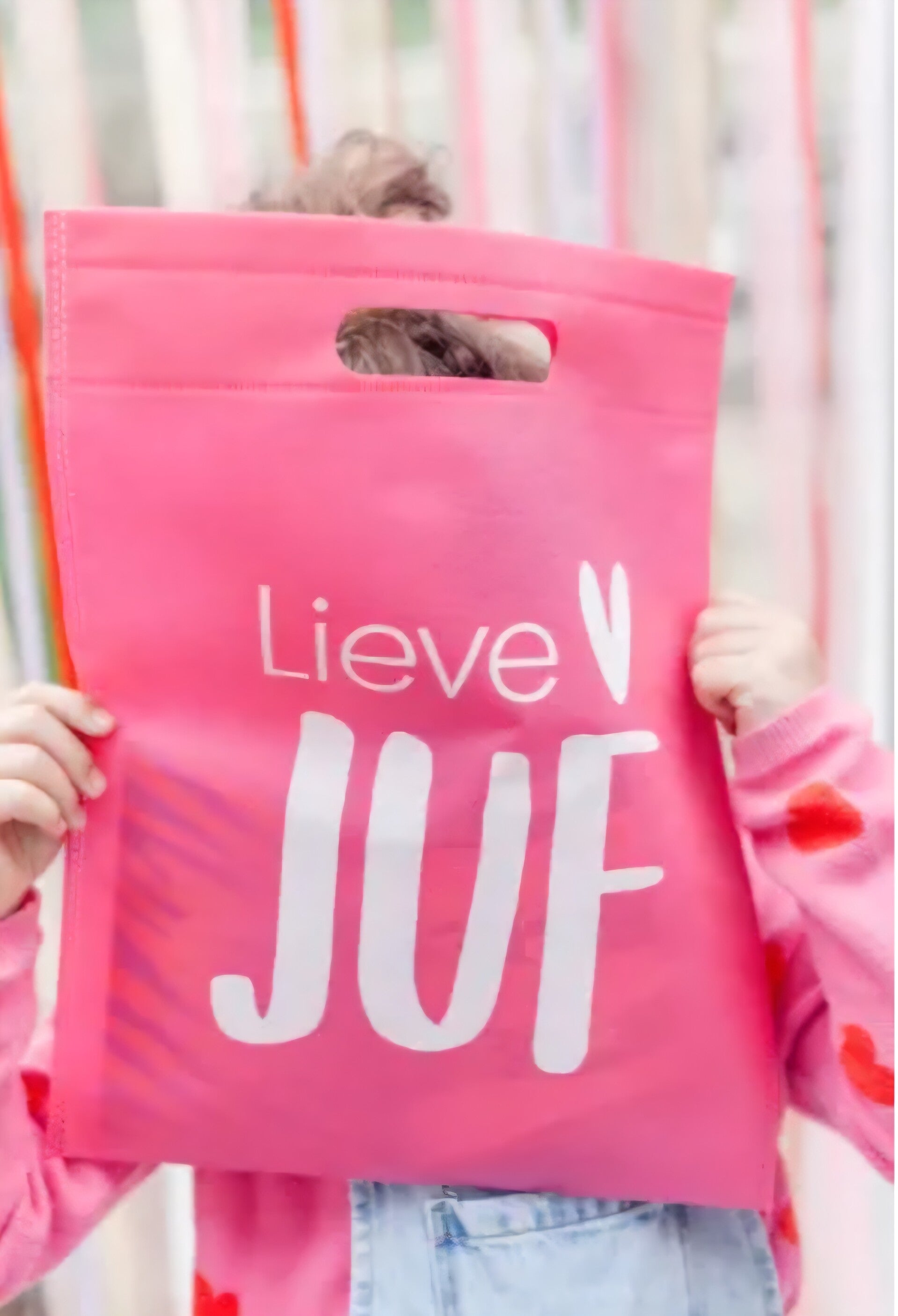 Voor de juf die alles geeft, alles onthoudt en áltijd klaarstaat. Deze roze juffentas is niet zomaar een tas, maar een klein bedankje in draagbare vorm. Met ruimte voor schriften, pennen, koekjes en complimentjes — en vooral: een heleboel waardering.