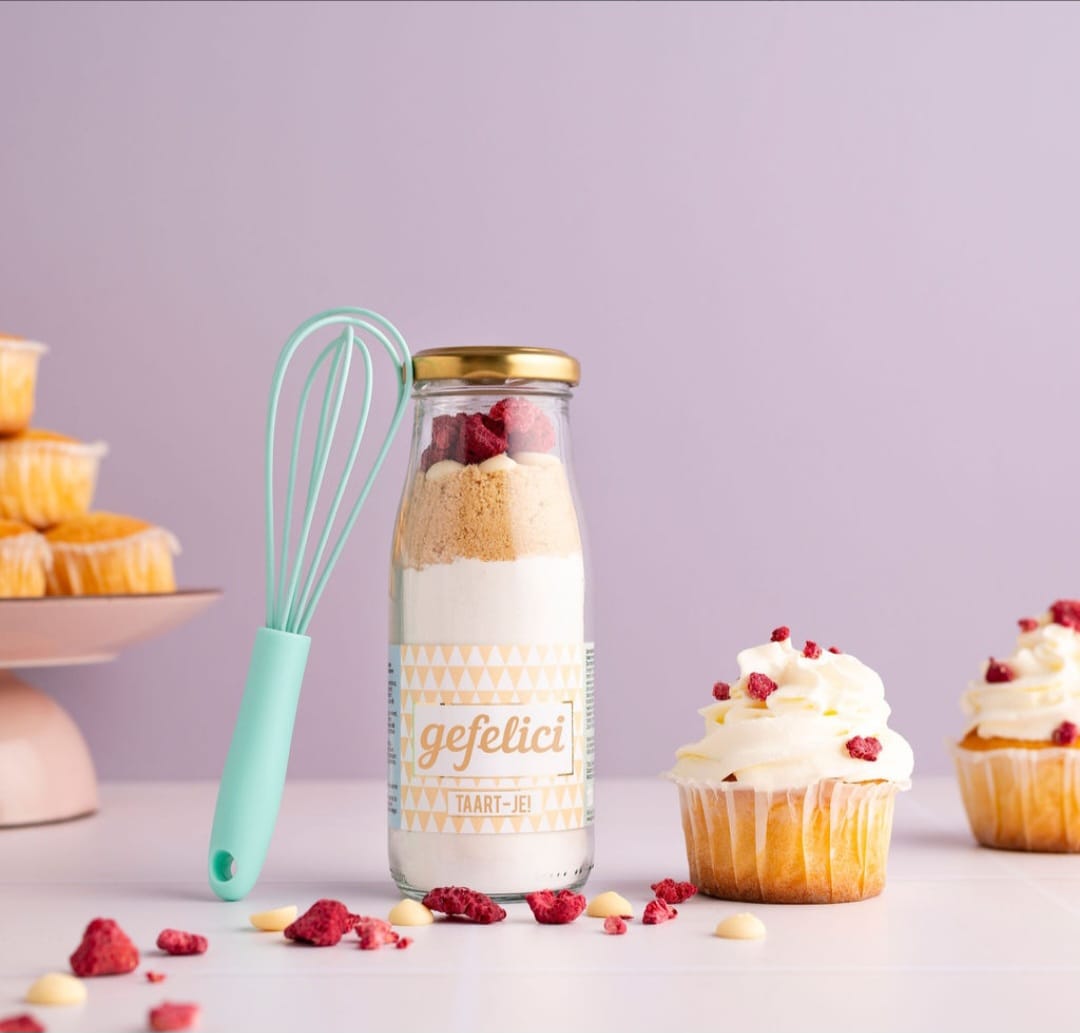 Elke fles zit boordevol zorgvuldig afgewogen ingrediënten voor een heerlijk feesttaartje met frambozen en witte chocola. Het valt gegarandeerd goed in de smaak bij de jarige!