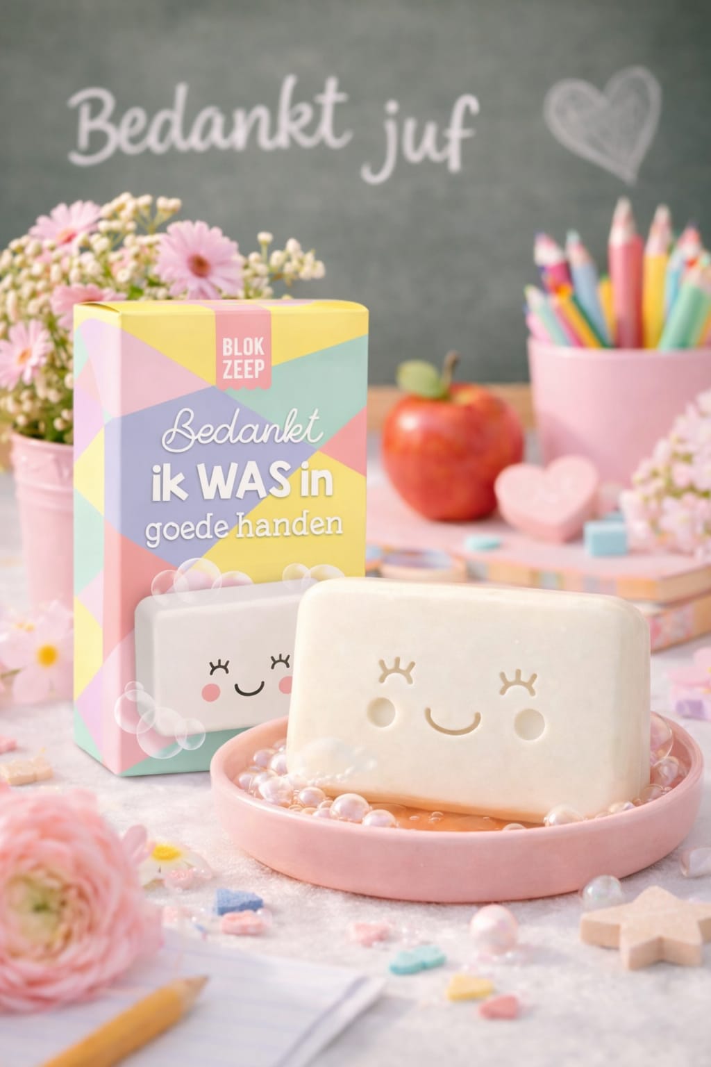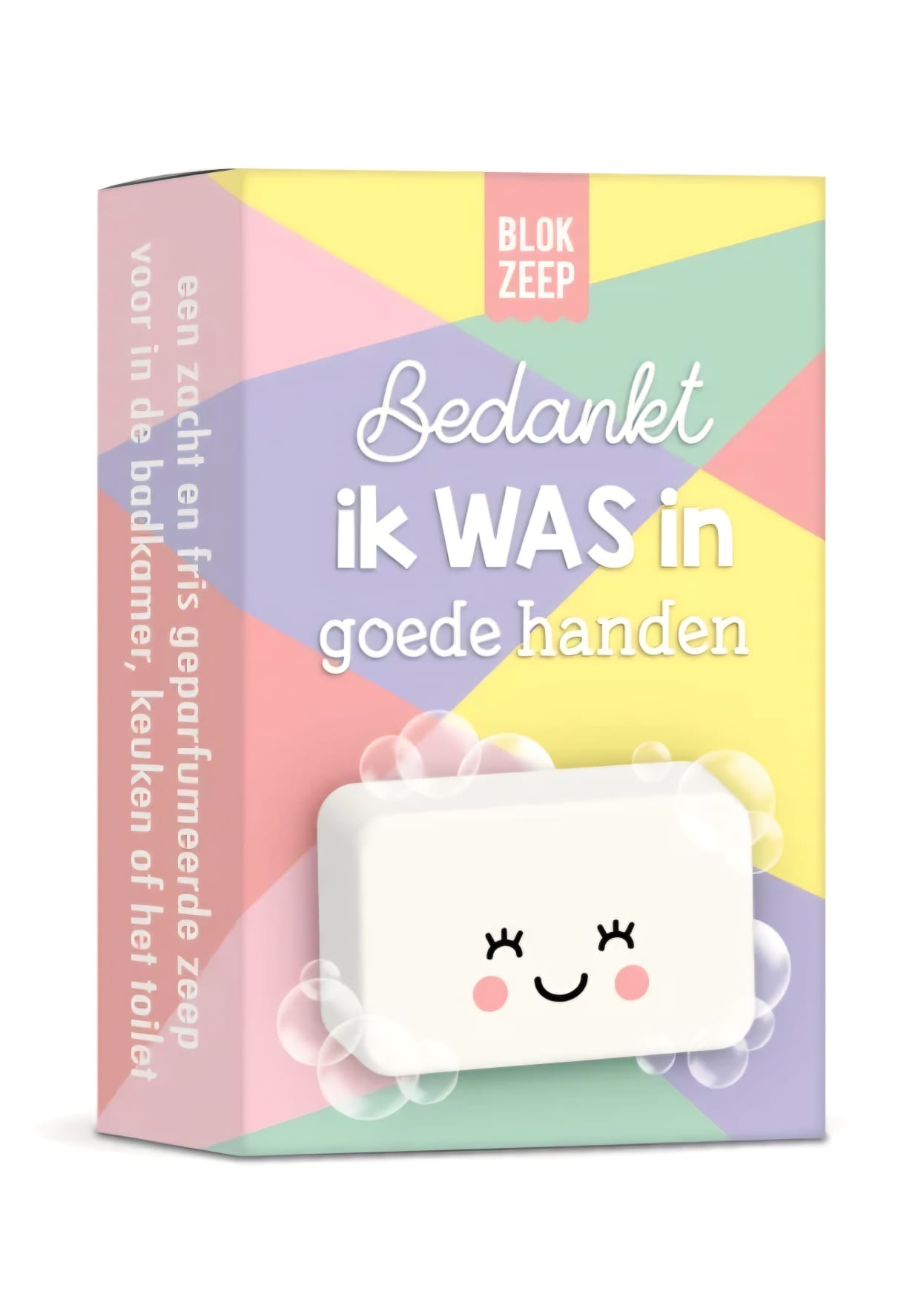 ‘Bedankt, ik WAS in goede handen’ is een woordgrapje tussen wassen en handen: dus deze zeep is perfect om je handen mee wassen! Daarnaast hebben we deze verpakking speciaal ontworpen om te geven als er afscheid wordt genomen. Neemt je kind afscheid van de peuterspeelzaal? Of van het kinderdagverblijf? Of wil je de meester of juf van je kids bedanken voor het afgelopen schooljaar? Of wil je je stagebegeleider bedanken voor alles? Geef dan dit leuke zeepje en vergeet niet een lief afscheidstekstje achterop te schrijven!